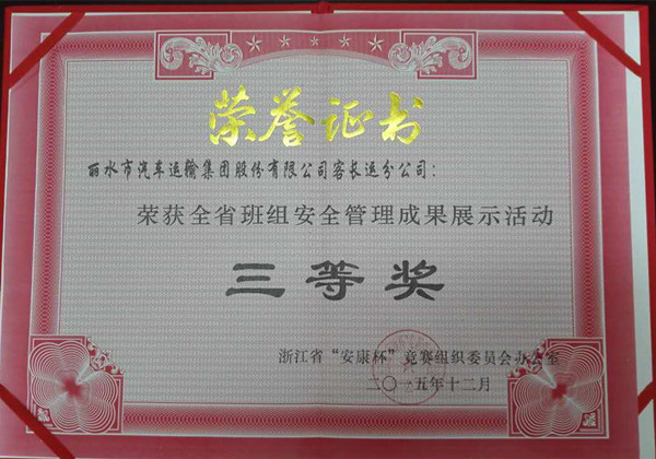 近日,浙江省“安康杯”競賽組織委員會發(fā)布“2015年全省班組安全管理成果展示活動評選結果的通報”,市總工會推薦報送的“麗汽集團長運分公司班組安全管理成果展示”獲三等獎。