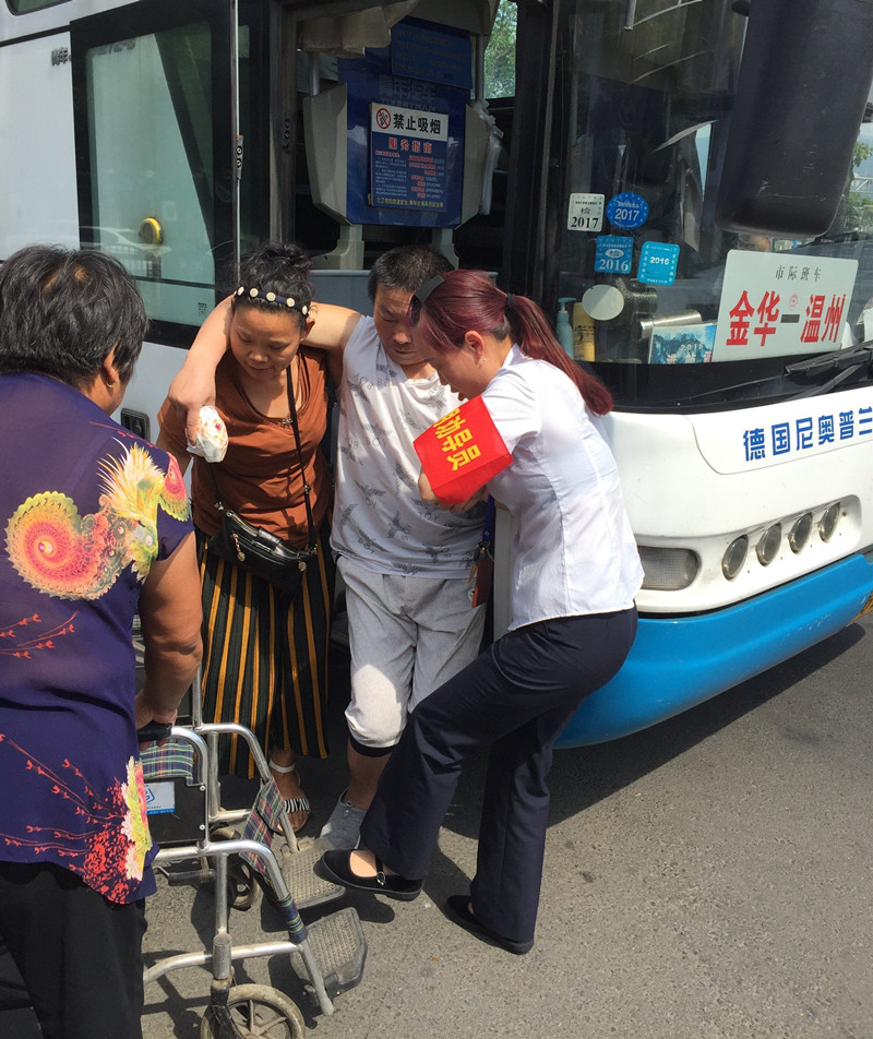 9:35金華到麗水的班車緩緩地駛進(jìn)了高鐵配載點(diǎn)。車一停穩(wěn),旅客們便陸陸續(xù)續(xù)的下車前往下一個(gè)目的地。眼尖的江旭紅看見一位中年婦女在車門處很吃力的拉著什么,江旭紅心想,車上可能有行動(dòng)不便的旅客需要下車。江旭紅全然不顧烈日的暴曬,毫不猶豫的迎上前去。果不其然,車門處的阿姨和車上的另一個(gè)阿姨正連拉帶抱的幫一位行動(dòng)不便的大叔下車。大叔看上去50多歲的樣子,因?yàn)榈昧四撤N疾病一點(diǎn)都不會(huì)做自主的動(dòng)作,全憑兩位阿姨慢慢地挪動(dòng),160多斤的體重給兩位阿姨扶他下車增加了不少的難度。才移下一個(gè)臺(tái)階,汗珠已經(jīng)順著兩位阿姨的臉頰往下淌。江旭紅立即從行李倉(cāng)拿出他們隨車攜帶的輪椅撐開,放在車門旁。由于車子臺(tái)階處較窄,站不下其他的人,江旭紅就在車下位置幫著把大叔的腳抬起來,待大叔被移到最后一級(jí)臺(tái)階時(shí),江旭紅順勢(shì)托起大叔的一只手,和車上那位阿姨一起,使盡渾身力氣一步一步慢慢地把大叔架到了輪椅上。接著江旭紅又把大叔送到陰涼處,等待家人來接。這時(shí)的江旭紅已是滿頭大汗,背上的衣服都濕透了。