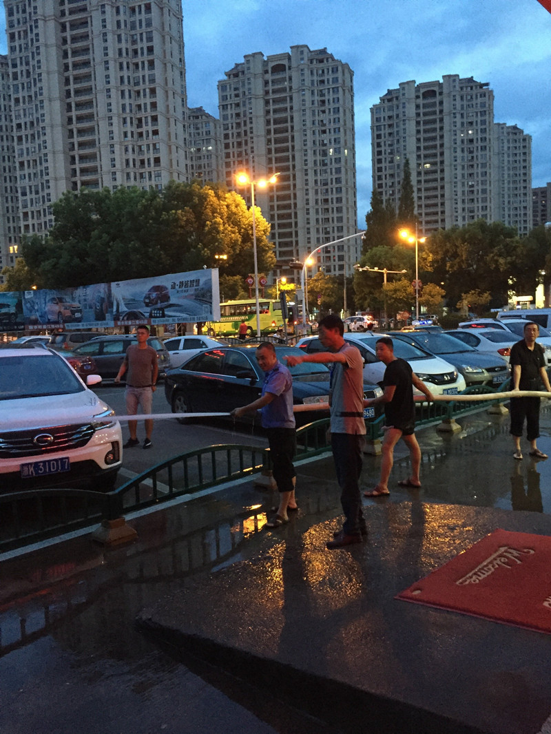 由于白天旅客進出較多,不方便沖洗,志愿者們就選擇客流相對少的時間傍晚下班時間,他們拿來掃把、水帶,對南門周邊的場地進行了徹底的沖洗。對一些“疑難雜癥”如油漬多的地面,隊員們就灑上洗衣粉,用長柄刷子刷洗后,再用水沖洗干凈。一個多小時后,夜幕已經降臨,但看著變得更加整潔的地面,志愿者們依舊持續(xù)工作著。