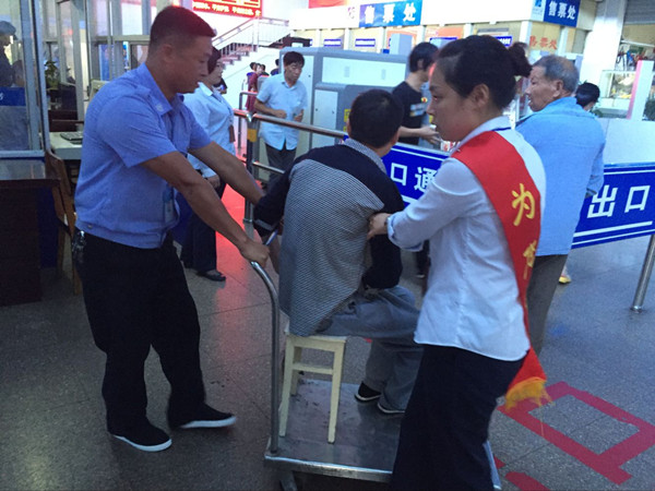 6月14日下午,在客運(yùn)東站的候車室里,一輛特殊的“輪椅”引起了大家的注意,只見東站副經(jīng)理戴宏星和保衛(wèi)科的熊宣標(biāo)推著由拉貨的行李車和小方凳組成的“輪椅”,余靜雙手扶著坐在“輪椅”上的旅客,他們?nèi)齻€人小心翼翼的護(hù)送旅客到檢票口。